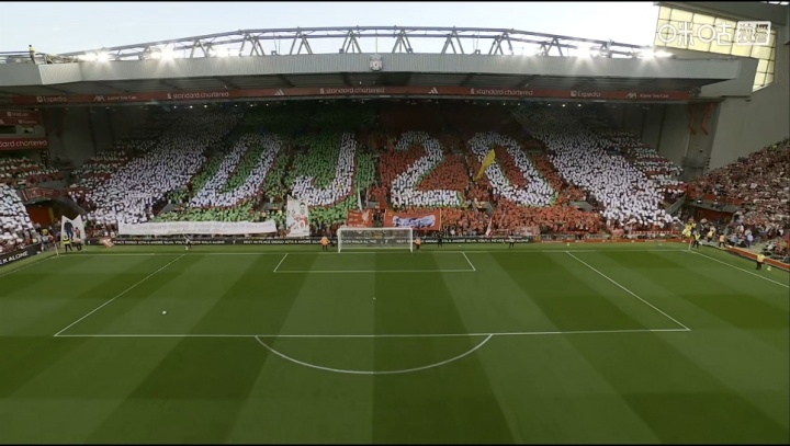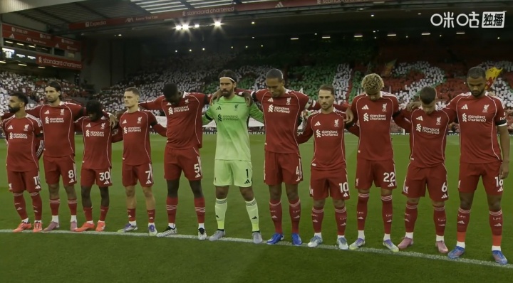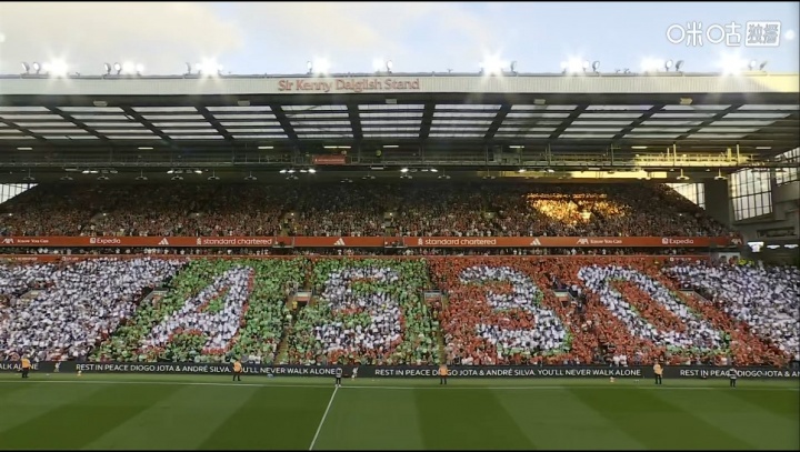 08月16日讯 利物浦vs伯恩茅斯,英超揭幕战,本场赛前,安菲尔德全场高唱you'll never walk alone,悼念过世的若塔。之后,现场举行默哀仪式,看台打出了DJ20和AS30来悼念若塔兄弟。