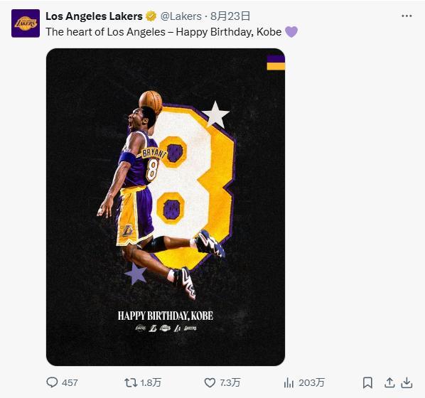 1、湖人官方:“洛杉矶之心,生日快乐,科比 ”