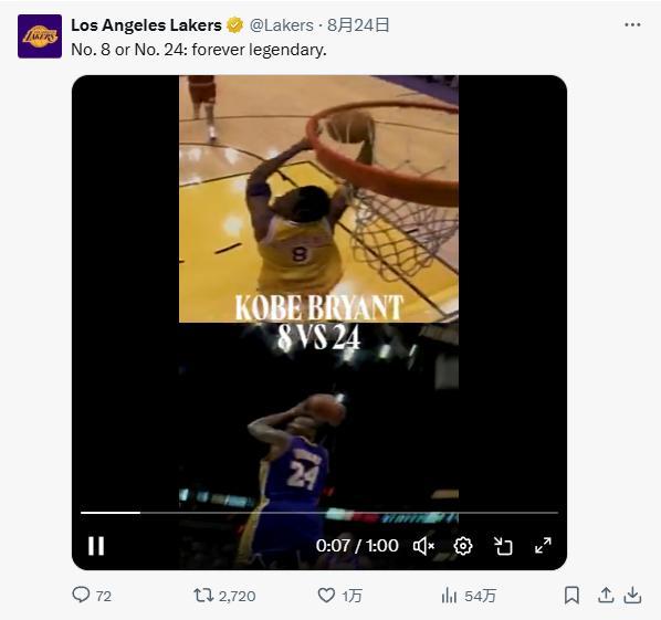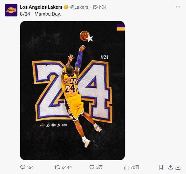 7、湖人官方:“8/24——曼巴日”