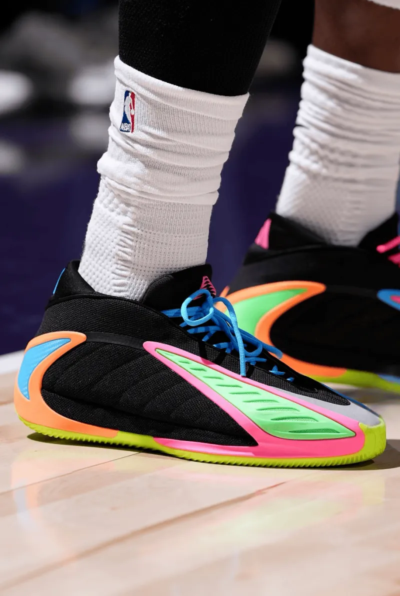 比赛中,爱德华兹上脚彩色adidas AE2。